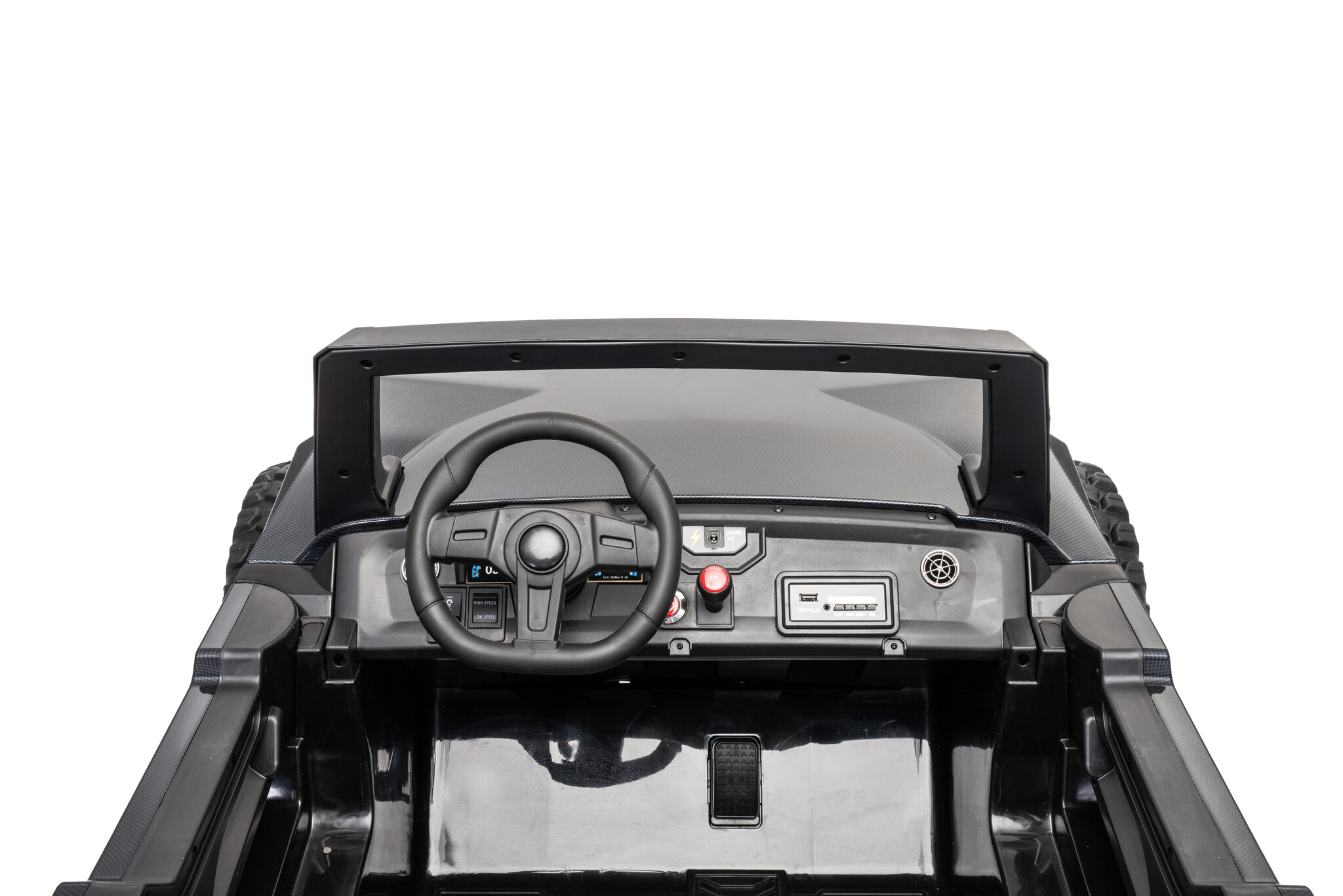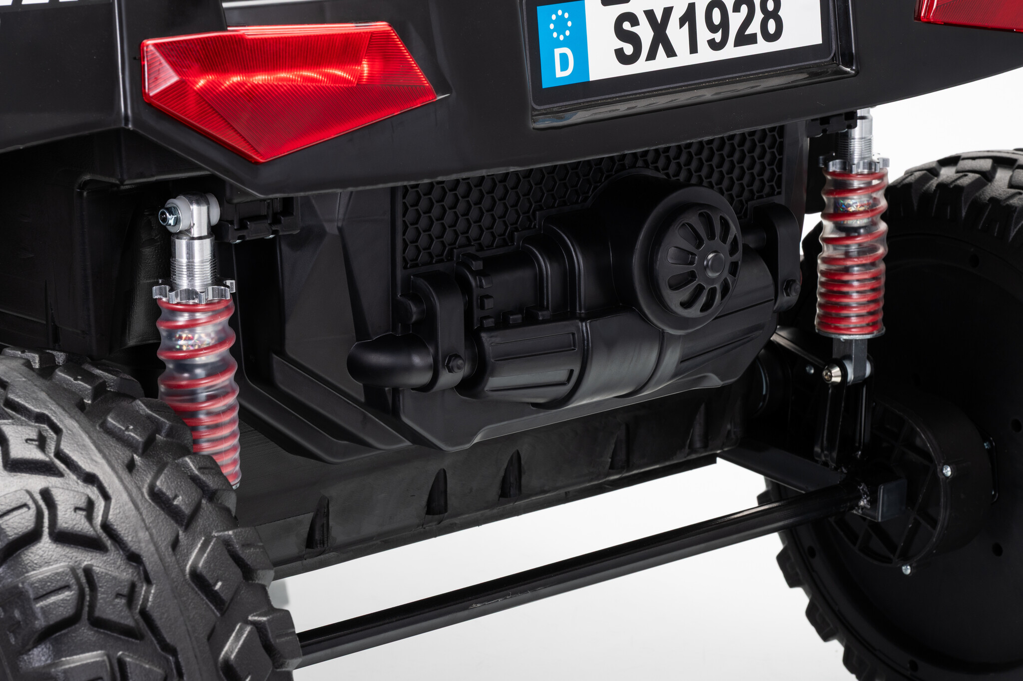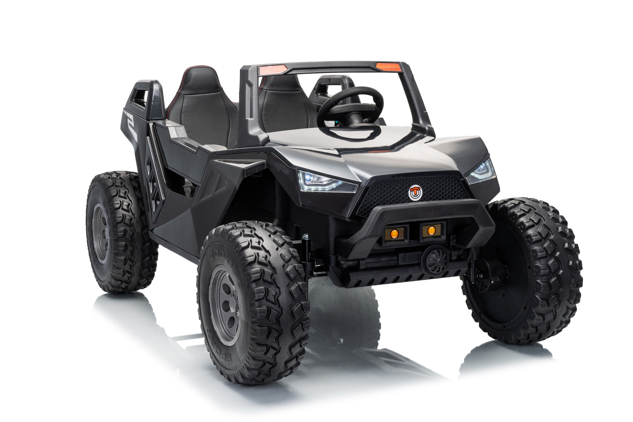 Uiteraard voor de kleine ontdekkers zit er een softstart 2.4ghz afstandsbediening bij waar mee de gehele buggy door de ouders bestuurd kan worden. Standaard 4x4(elke wiel heeft een 24V motor) 2x12V14ah accu (serie geschakeld naar 24V) softstart, rubberbanden etc.