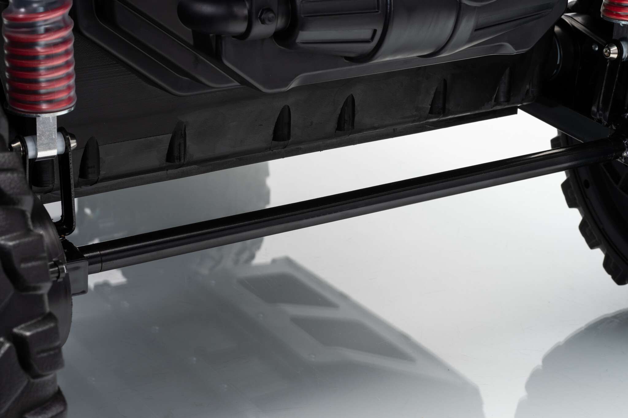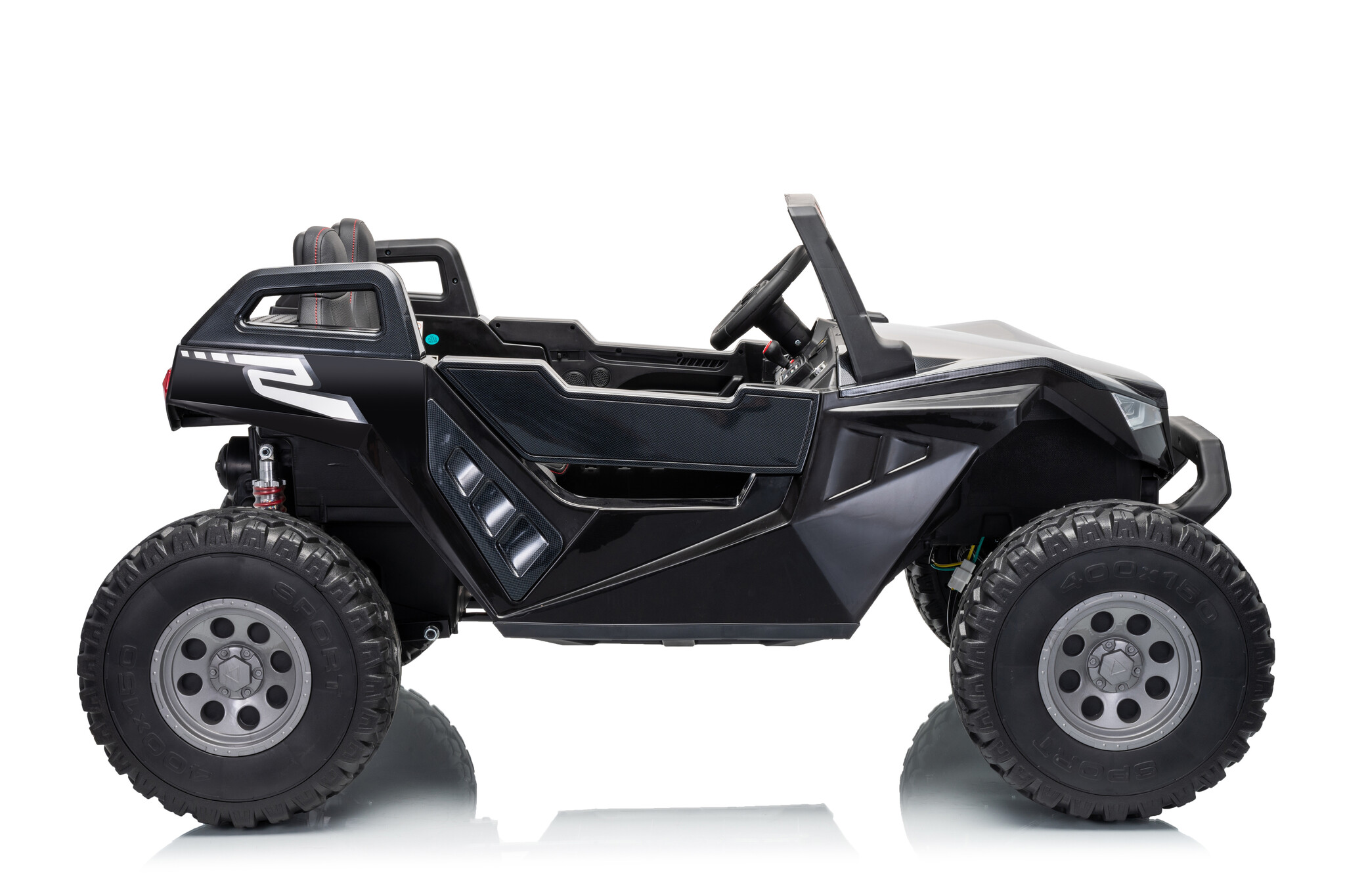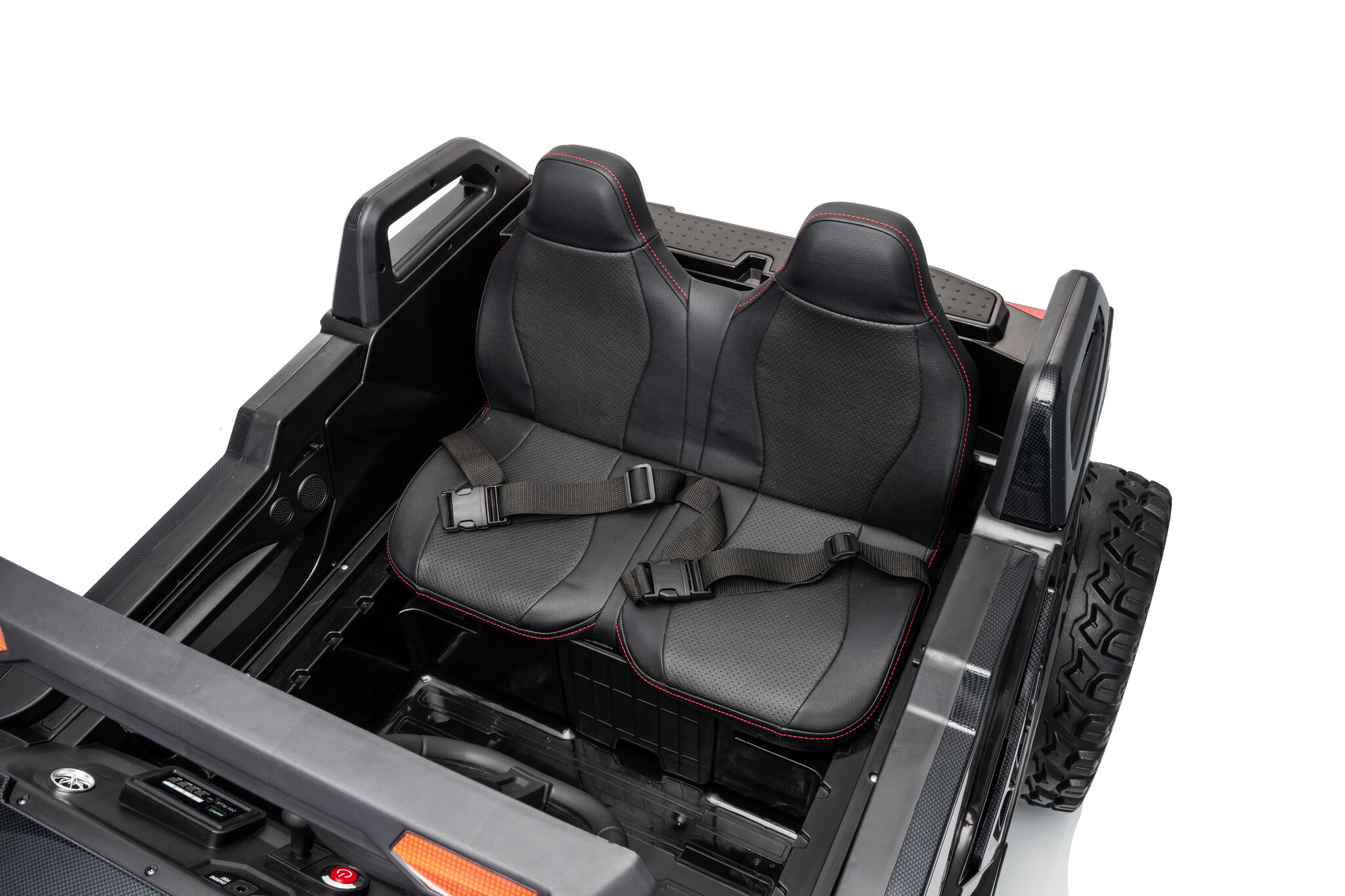 Uiteraard voor de kleine ontdekkers zit er een softstart 2.4ghz afstandsbediening bij waar mee de gehele buggy door de ouders bestuurd kan worden. Standaard 4x4(elke wiel heeft een 24V motor) 2x12V14ah accu (serie geschakeld naar 24V) softstart, rubberbanden etc.