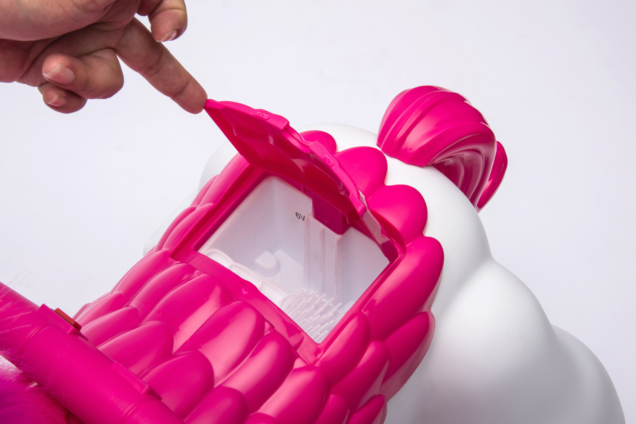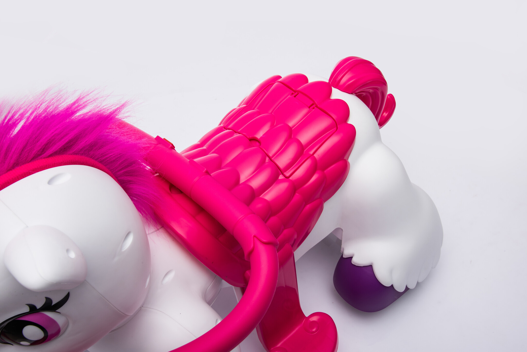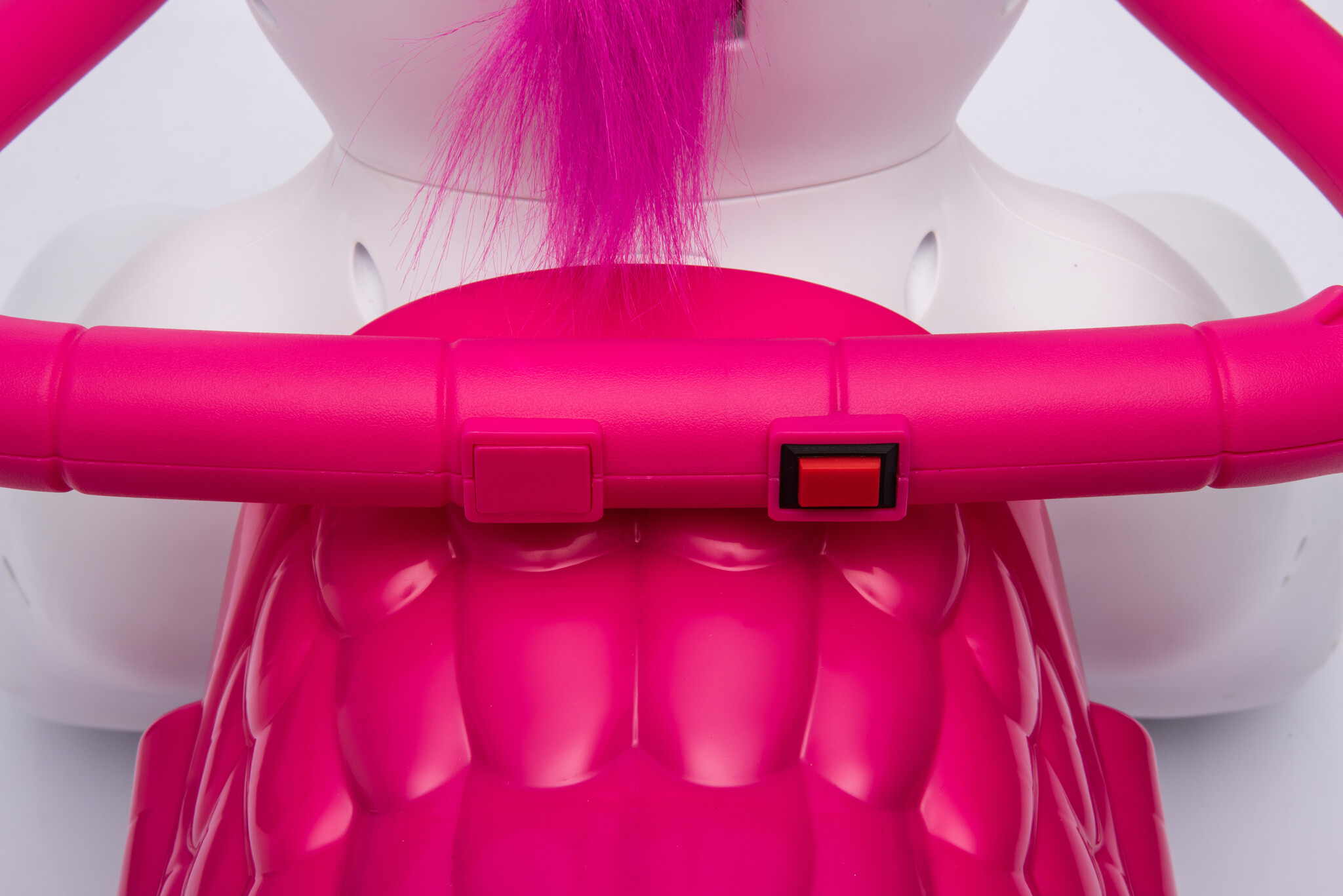 Geef de pony een wortel en eetgeluiden beginnen. Ga je het paardje borstelen, dan zal het gaan hinneken van plezier. De wortel en de borstel zijn op te bergen in een vakje onder de zitting.