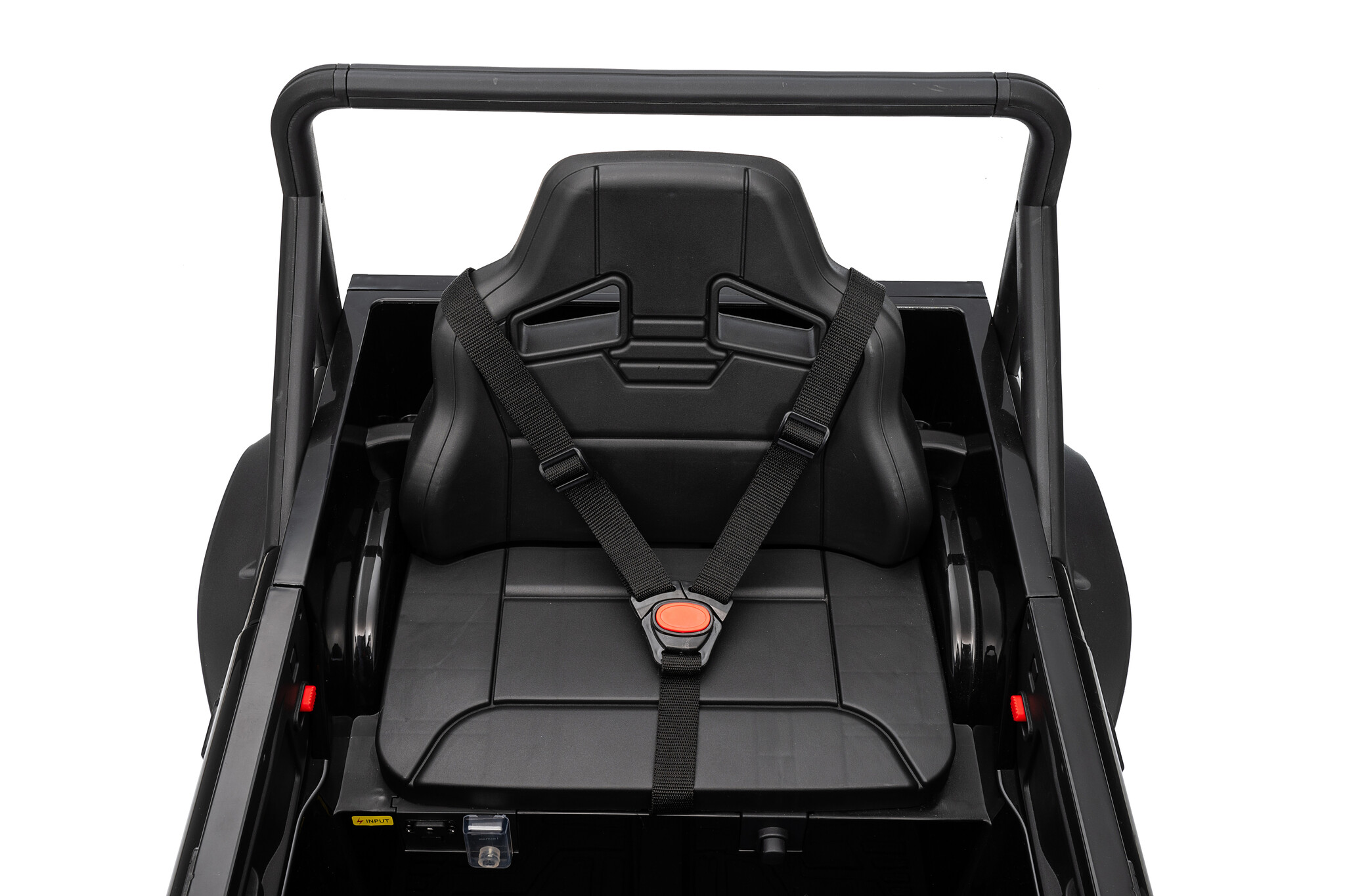 De auto is voorzien van 4x 12 volt motoren en is daardoor in staat om over gras of onverharde ondergrond te rijden. Verder heeft deze auto 2 echte deuren, koplampen, voor en achter verlichting en krijgt u de mogelijkheid om eigen muziek af te spelen d.m.v. van een standaard radio en bluetooth. Aangezien de auto is voorzien van een “soft start” voelen de kinderen geen schokje bij het optrekken. De auto wordt gestart doormiddel van een meegeleverde sleutel.