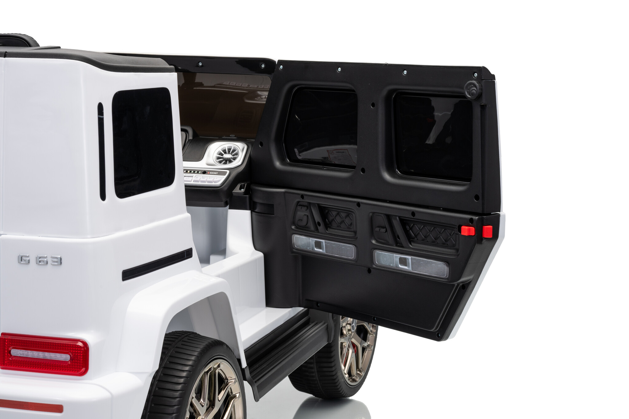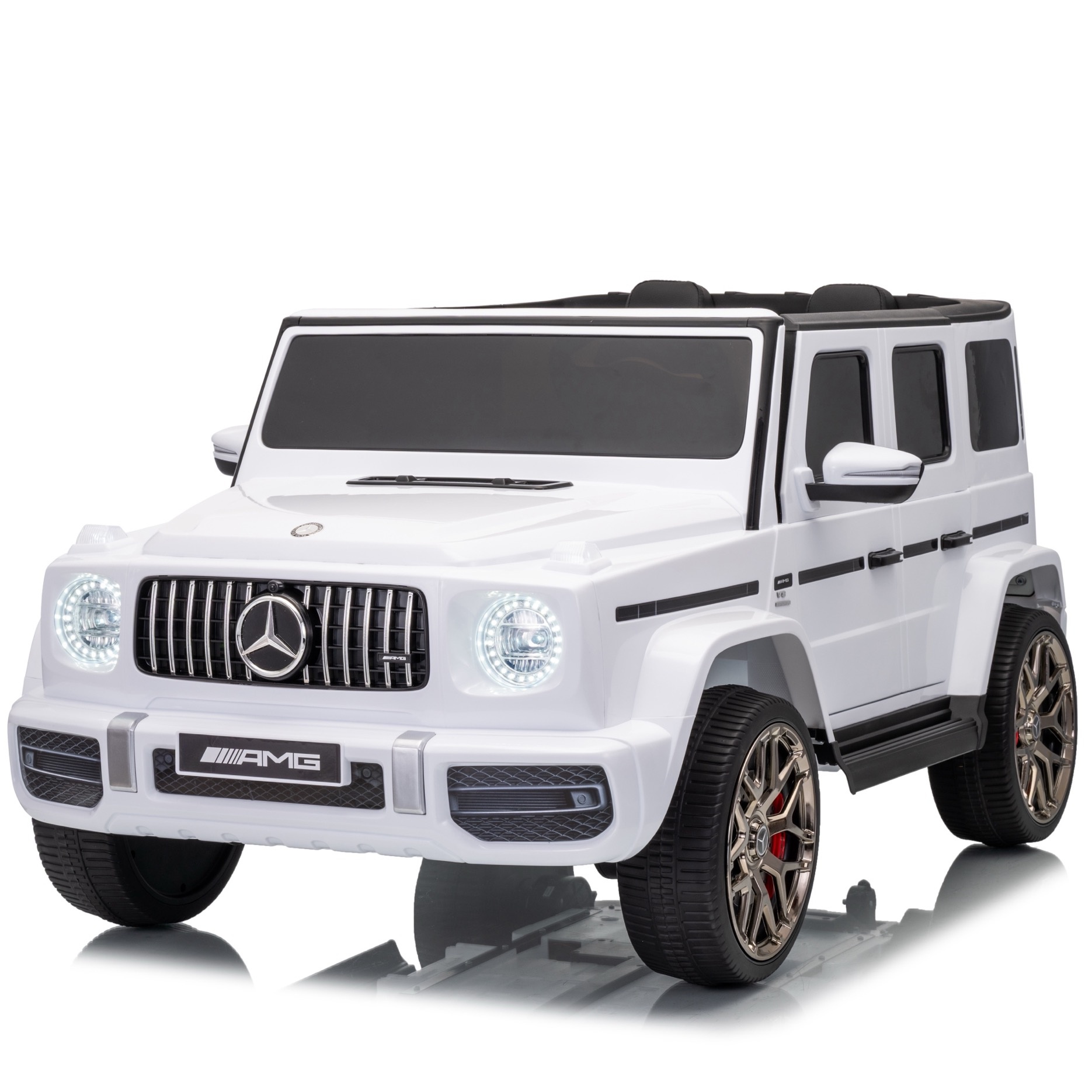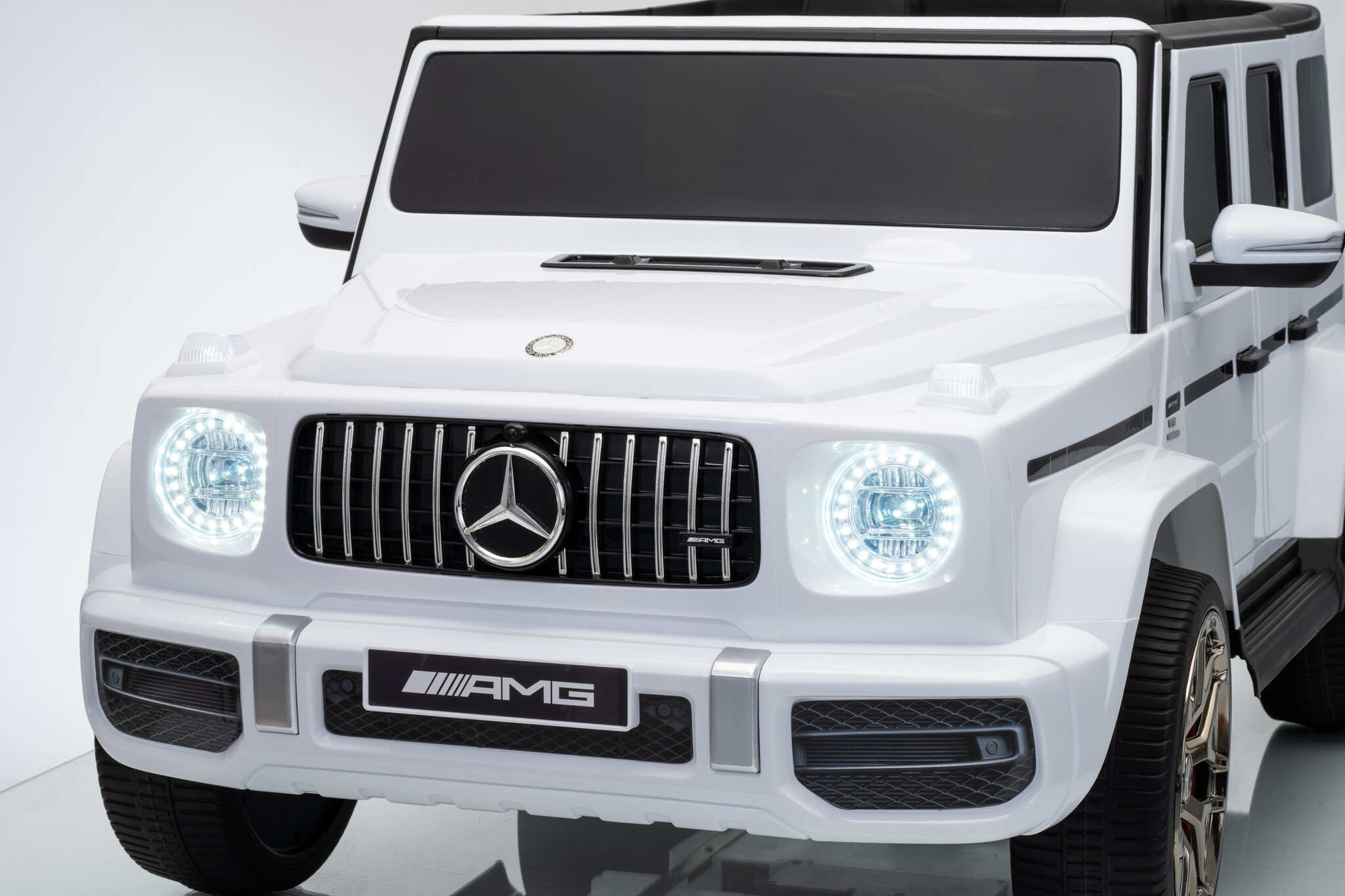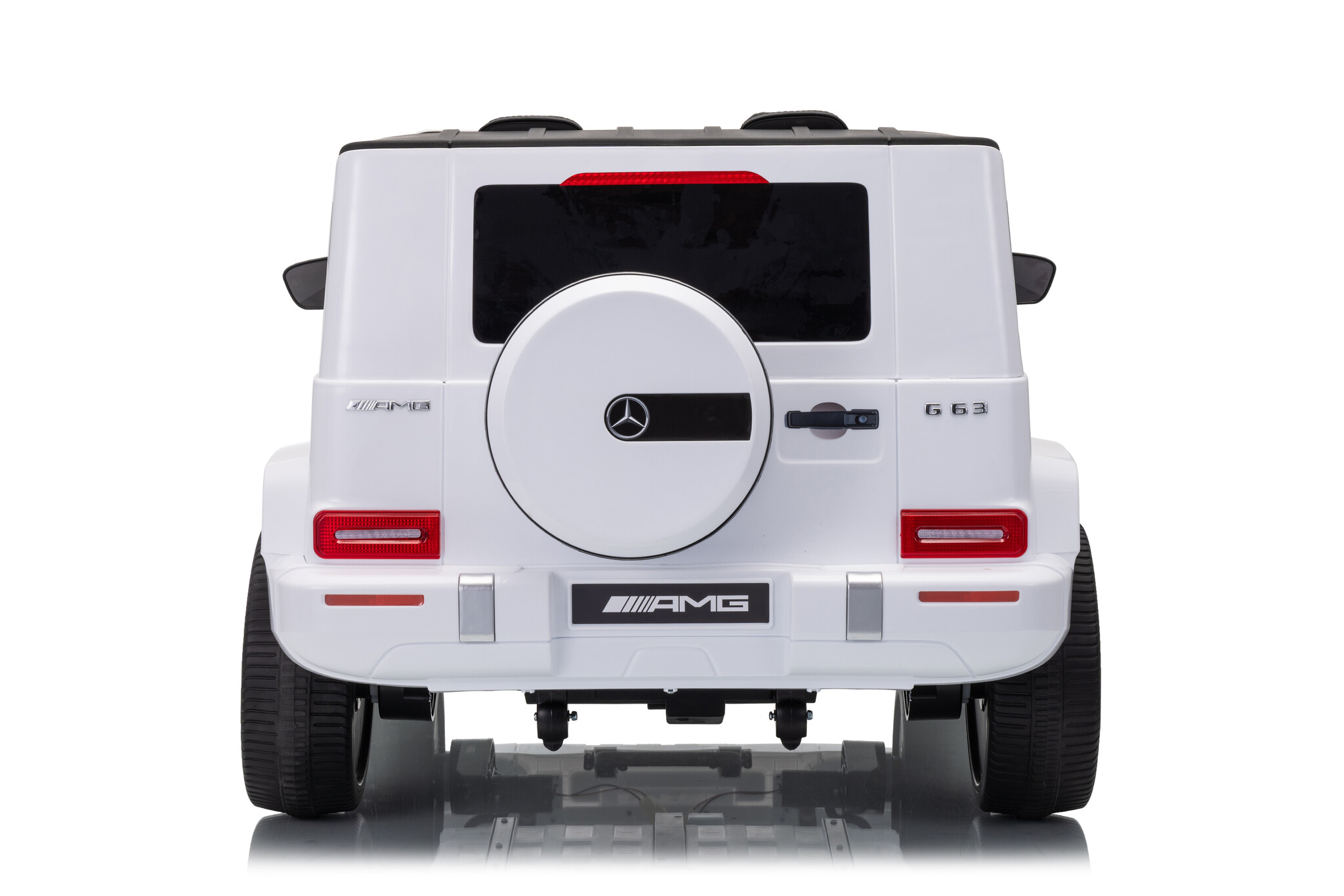 Deze ruime Mercedes G63 AMG kinderauto 4x4 in het wit is de ideale keuze als u op zoek bent naar een grote auto voor 1 kind of een auto voor 2 kinderen. De witte Mercedes elektrische kinderauto is geschikt voor twee kinderen van 1 tot 6 jaar. De Mercedes G63 AMG wordt onder licentie van Mercedes-Benz geproduceerd en is daardoor bijna niet van echt te onderscheiden.