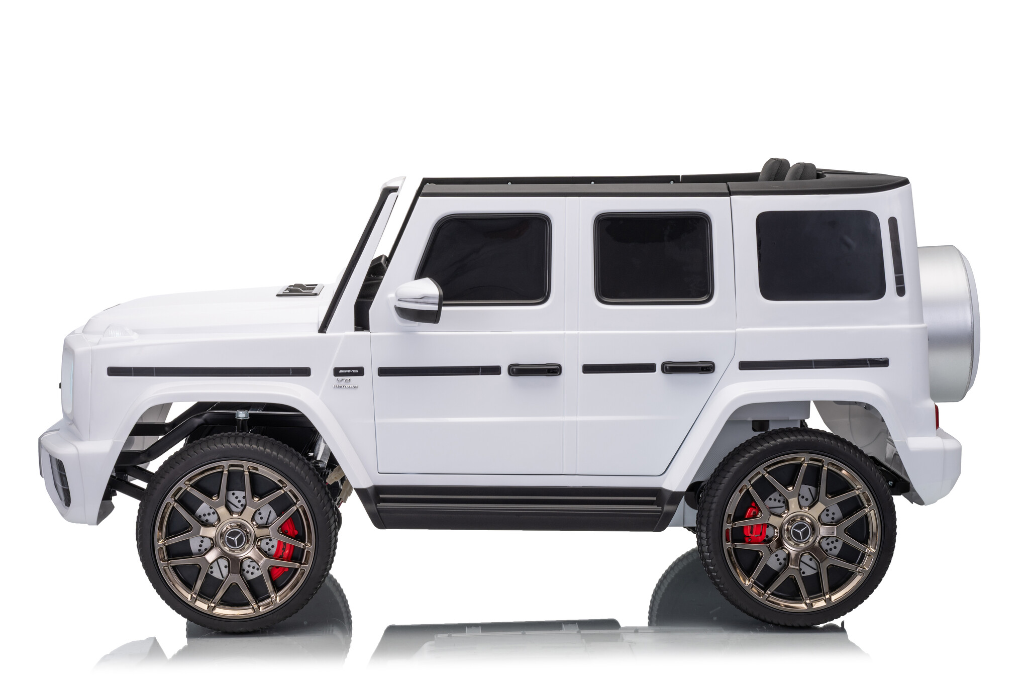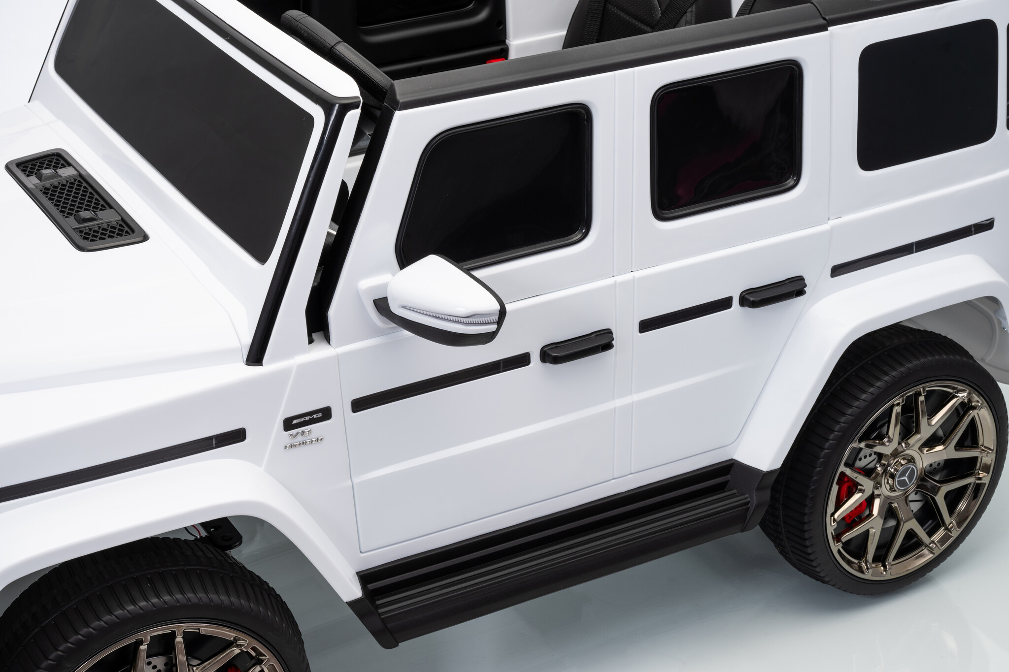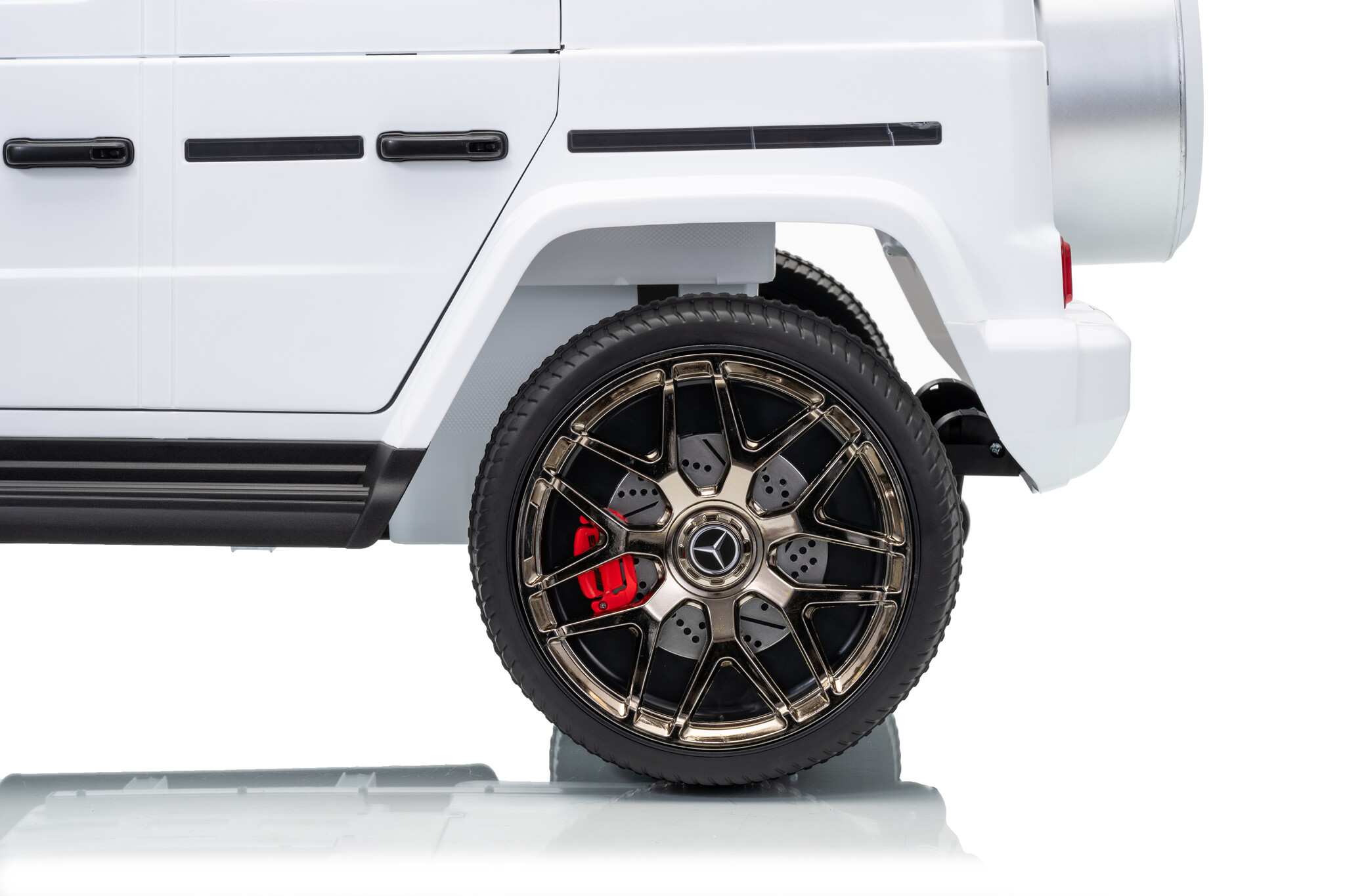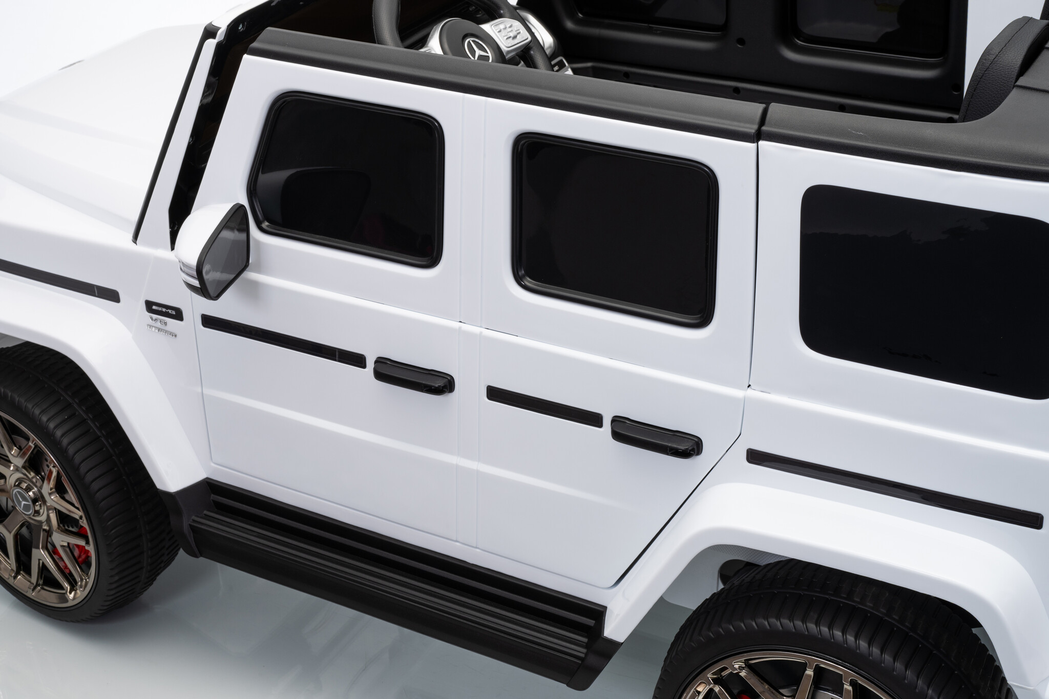 Deze ruime Mercedes G63 AMG kinderauto 4x4 in het wit is de ideale keuze als u op zoek bent naar een grote auto voor 1 kind of een auto voor 2 kinderen. De witte Mercedes elektrische kinderauto is geschikt voor twee kinderen van 1 tot 6 jaar. De Mercedes G63 AMG wordt onder licentie van Mercedes-Benz geproduceerd en is daardoor bijna niet van echt te onderscheiden.