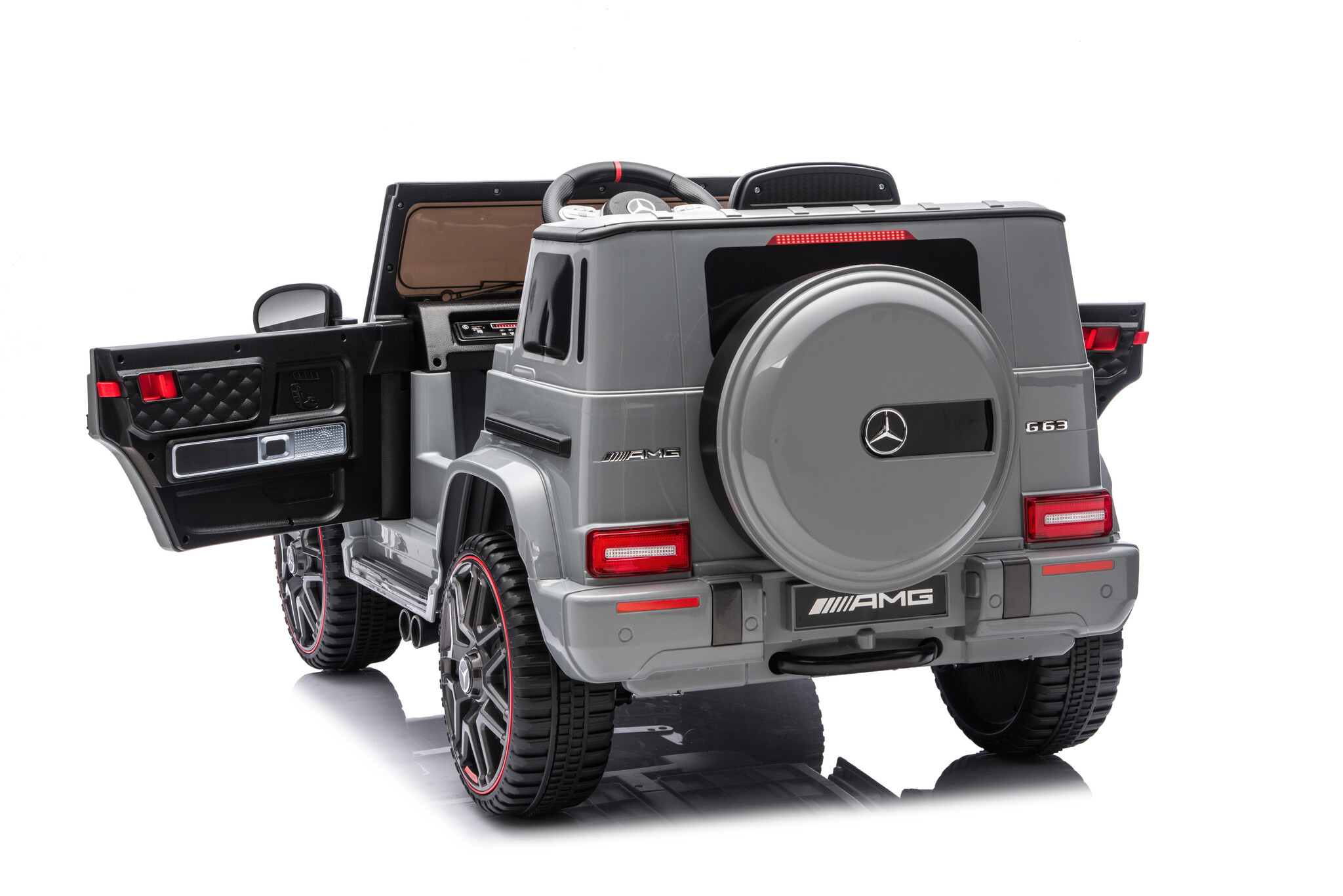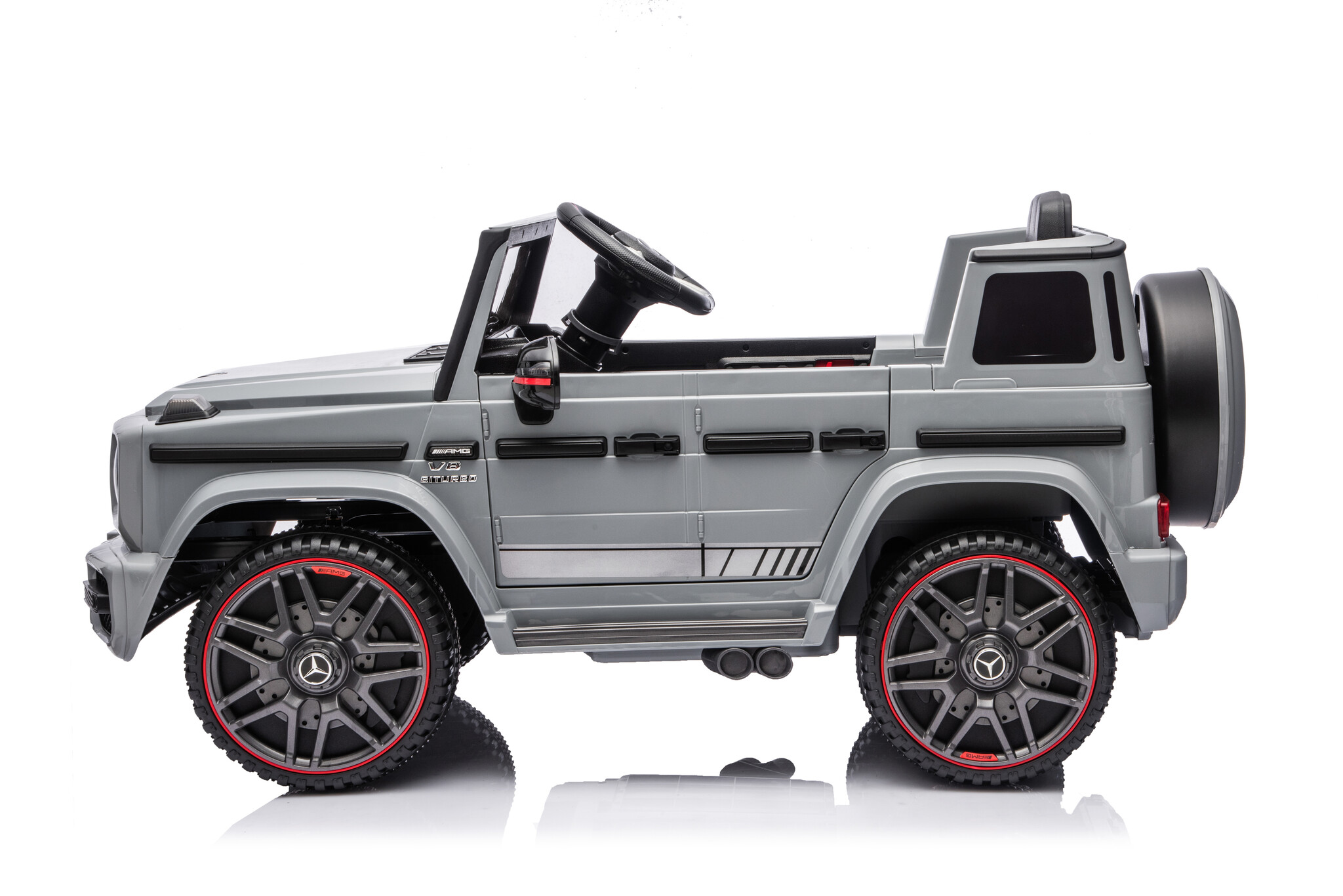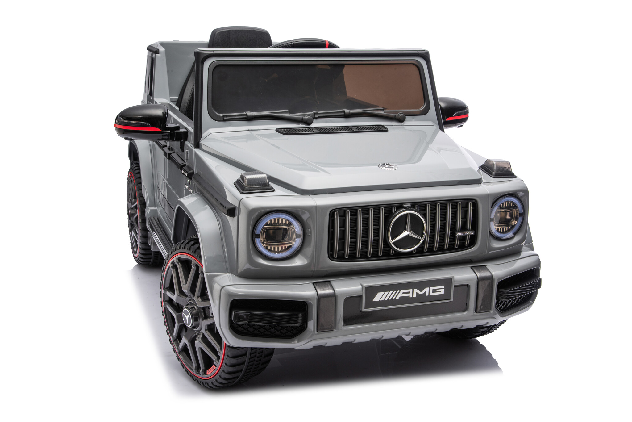 De Mercedes Benz G63 Cabrio AMG accu kinderauto in het grijs is een zeer populair model onder de kinderen en volwassenen. Door zijn mooie rode accenten maakt die deze grijze Mercedes Benz G63 Cabrio kinderauto een absoluut beest. Deze Mercedes G63 Cabrio elektrische kinderauto is geschikt voor kinderen van 1 tot 4 jaar.
